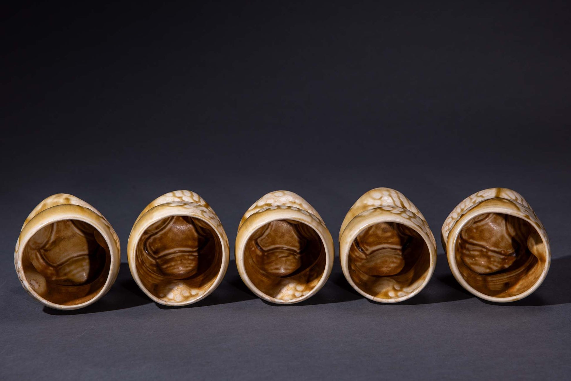 This ceramic cup has an organic, sculpted shape with voluptuous, full, flowing form and soft indentations, allowing for a comfortable grip. The cup is dotted with areas of bare clay, which have a smooth texture that contrasts with the glossy matte, sometimes dry glaze. Its rim is slightly irregular, adding to its hand-formed aesthetic. The inside is fully glazed. The indentations on the outside create an interior that looks like wind eroded caverns.